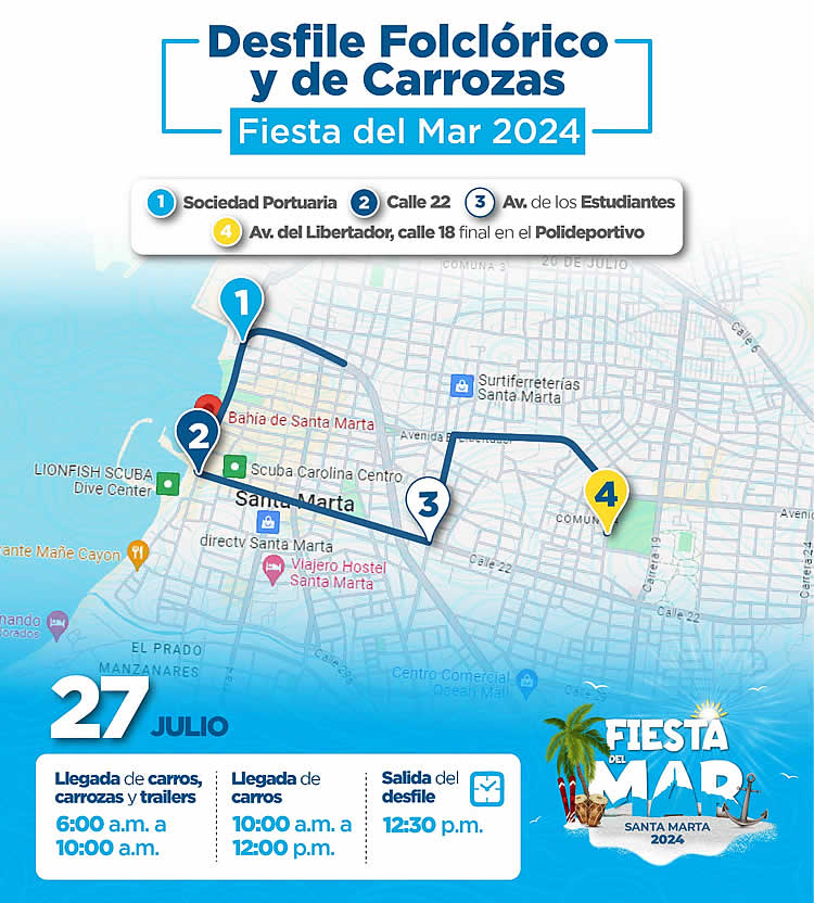 El desfile comenzará a la 1:00 pm en la Sociedad Portuaria, ubicada en la avenida de Los Fundadores (carrera 1). Luego, recorrerá las principales avenidas de la ciudad, como la Santa Rita, el Rumbódromo, la de los Estudiantes y la del Libertador, hasta llegar a su destino final: el estadio Eduardo Santos.