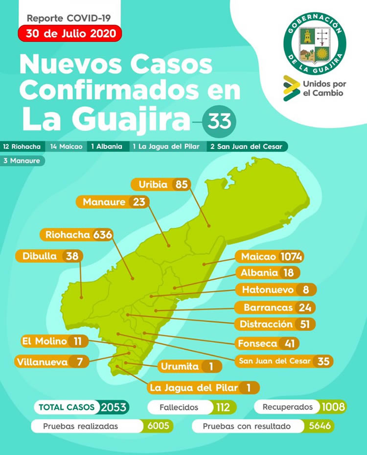 La Secretaría de Salud Departamental confirmó 33 nuevos casos positivos de Coronavirus Covid-19 en La Guajira, registrados en los municipios de Maicao, Riohacha, Manaure, San Juan del Cesar, Albania, y La Jagua del Pilar .