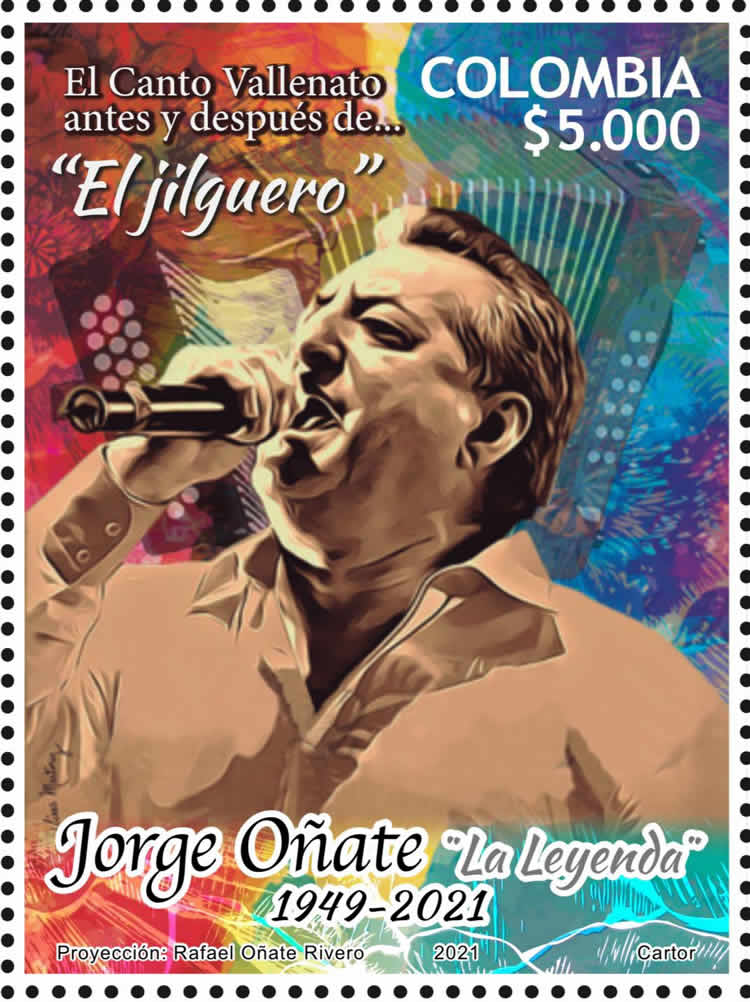 Como «El Jilguero de América» y «Ruiseñor del Cesar» conocían al célebre artista vallenato Jorge Oñate, un cantautor que revolucionó los cánones prestablecidos en la interpretación vocal de la música vallenata. Por esta razón, y cómo un homenaje póstumo solicitado por algunos senadores de la República, el Ministerio de las Tecnologías de la Información y las comunicaciones (MinTIC) aprobó a través de la resolución 954 de abril 23 de 2021 la emisión, «Jorge Oñate 1949 – 2021 ‘La Leyenda'», y ordenó al Operador Postal Oficial, Servicios Postales Nacionales S.A., 4-72 su producción.