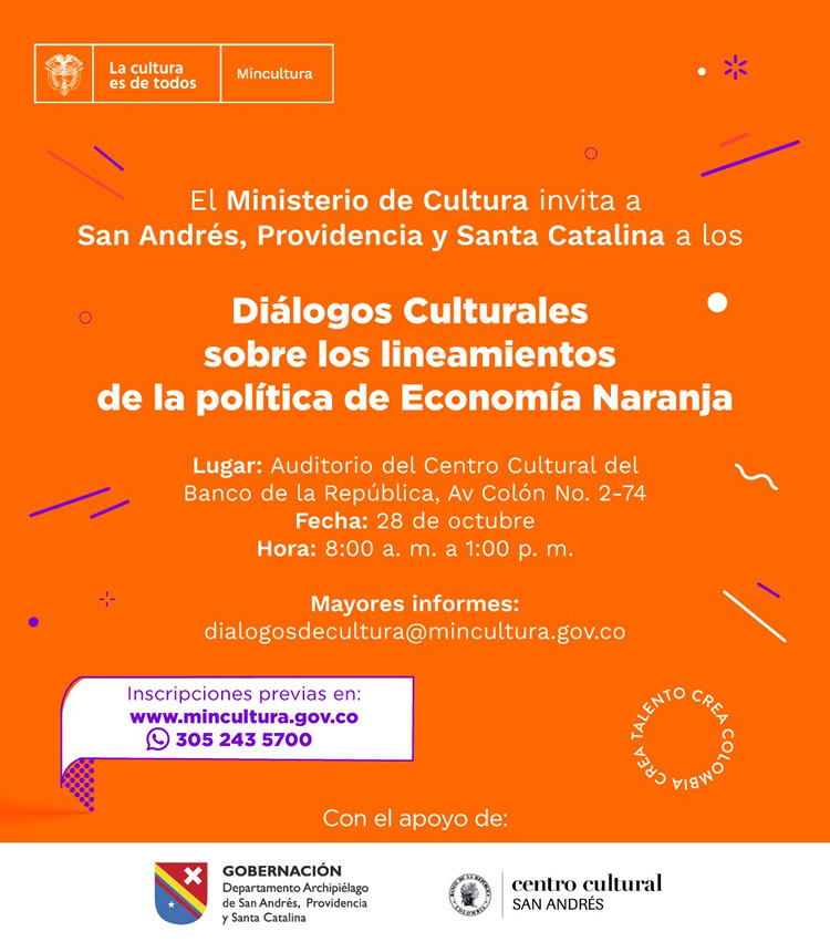En asocio con las entidades vinculadas al Consejo de Economía Naranja, y en esta ocasión con la Gobernación del Archipiélago, el Ministerio de Cultura se ha propuesto a convocar a en estos espacios a diversos actores de las artes y el patrimonio, de las industrias creativas, de las creaciones funcionales (medios digitales, diseño y publicidad) y a todos los sectores que hacen parte de la Economía Naranja.